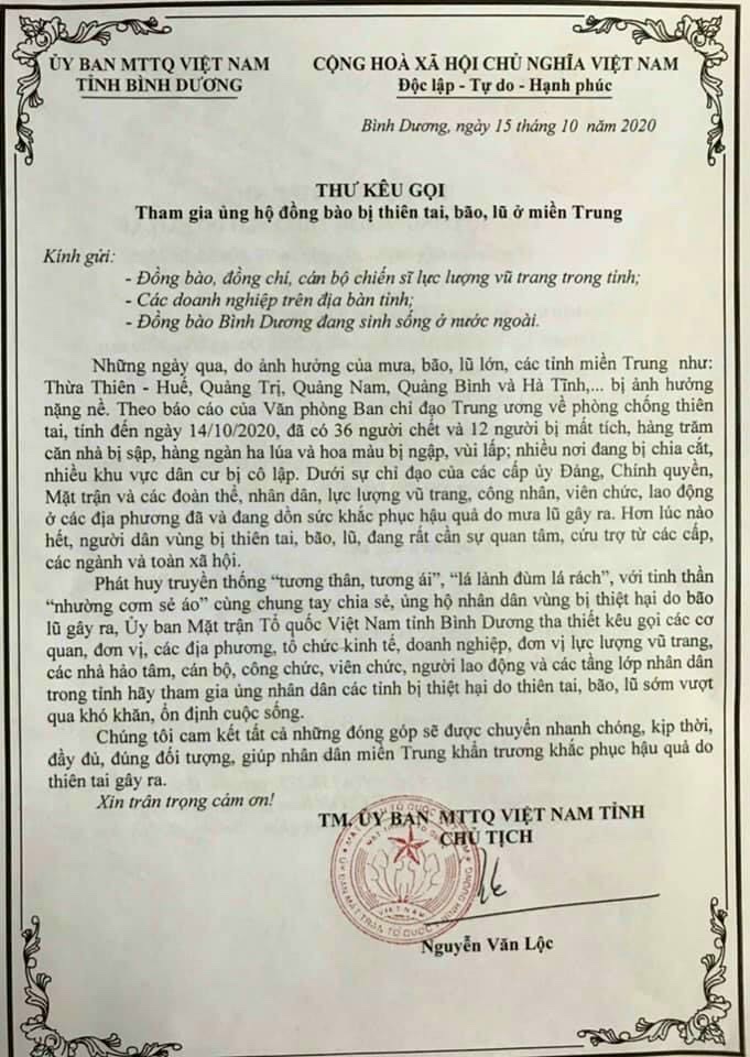 Ủy ban Mặt trận Tổ quốc tỉnh Bình Dương (Ban Cứu trợ), số tài khoản 37510.9040519.00000, tại Kho bạc Nhà nước Bình Dương.