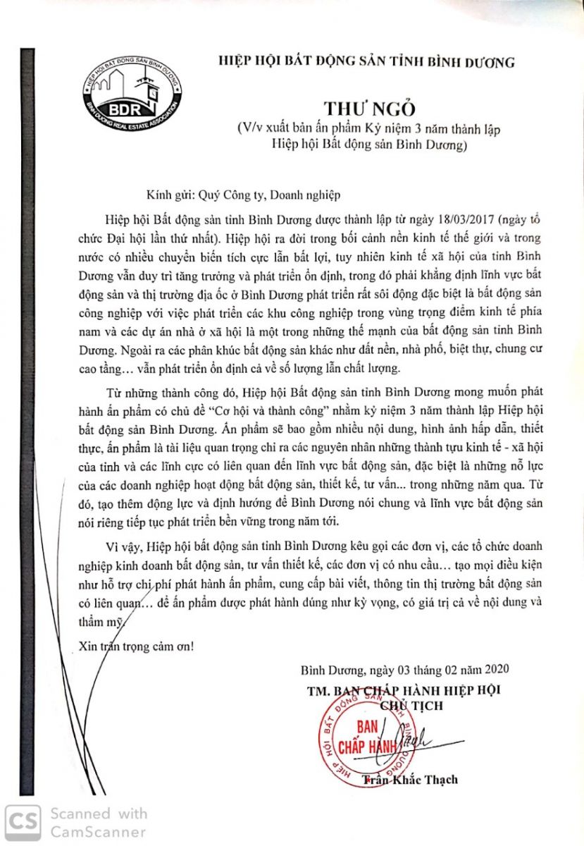 Hiệp hội bất động sản tỉnh Bình Dương kêu gọi các đơn vị, các tổ chức doanh nghiệp kinh doanh bất động sản, tư vấn thiết kế, các đơn vị có nhu cầu… tạo mọi điều kiện như hỗ trợ chi phí phát hành ấn phẩm, cung cấp bài viết, thông tin thị trường bất động sản có liên quan… để ấn phẩm được phát hành đúng như kỳ vọng, có giá trị cả về nội dung và thẩm mỹ.