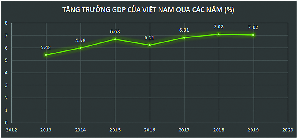 Tổng sản phẩm trong nước (GDP) năm 2019 đạt kết quả ấn tượng với tốc độ tăng 7,02% vượt mục tiêu của Quốc hội đề ra từ 6,6%-6,8% (Quý I tăng 6,82%, quý II tăng 6,73%; quý III tăng 7,48%; quý IV tăng 6,97%). Đây là năm thứ hai liên tiếp tăng trưởng kinh tế Việt Nam đạt trên 7% kể từ năm 2011.
