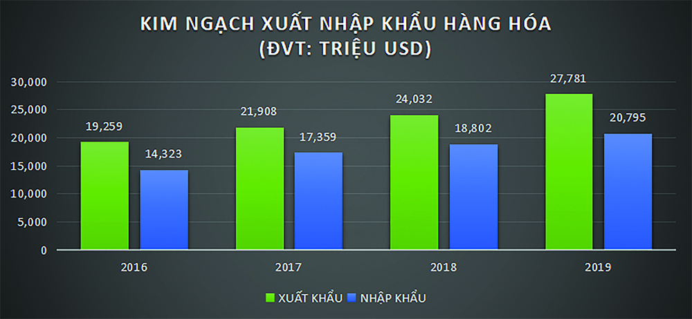 Năm 2019, cán cân thương mại xuất siêu 6,98 tỷ USD, trong đó: khu vực kinh tế trong nước xuất siêu 1,89 tỷ USD; khu vực kinh tế có vốn đầu tư trực tiếp nước ngoài xuất siêu 5,09 tỷ USD.